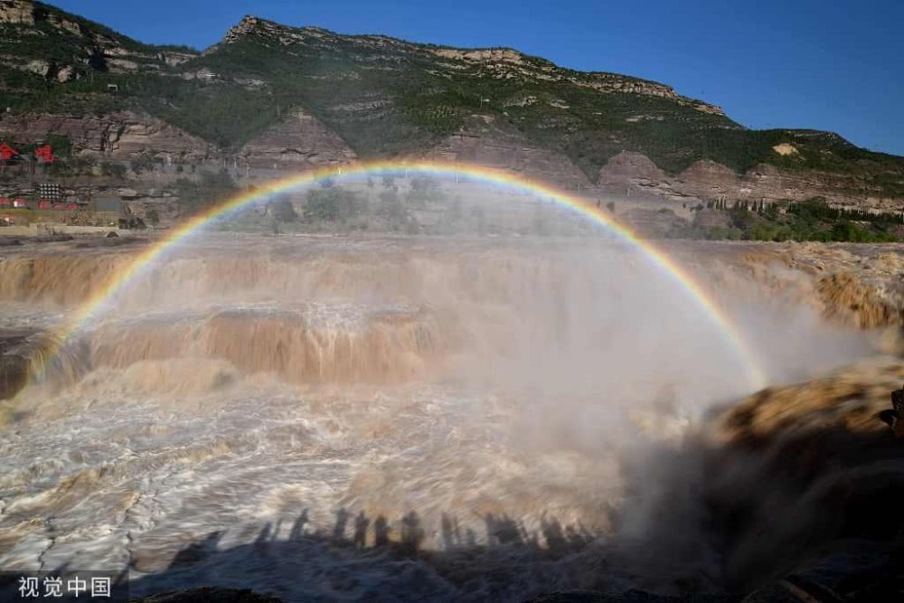 2019年8月17日,山西臨汾,游客在吉縣黃河壺口瀑布欣賞“彩虹門(mén)”景觀(guān)。
