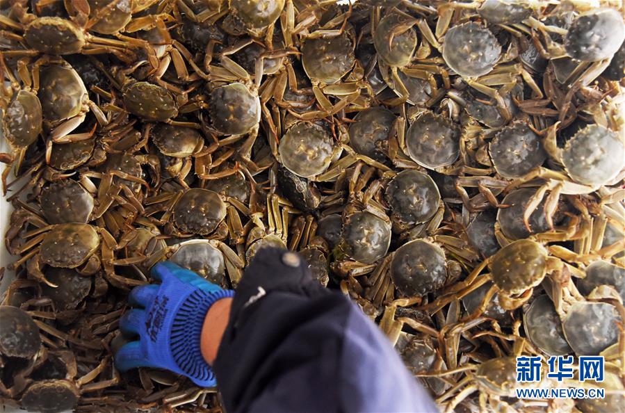 10月17日,東營(yíng)市惠澤農(nóng)業(yè)科技有限公司黃河口大閘蟹養(yǎng)殖區(qū)的工人在撿拾大閘蟹進(jìn)行稱重。新華社記者 王凱 攝