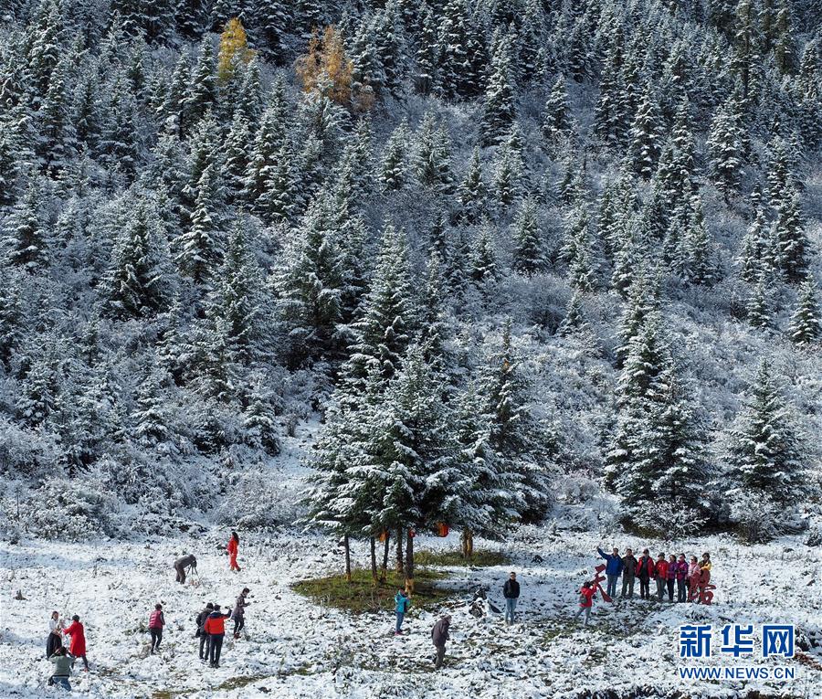 10月17日,在川藏線高爾寺山至理塘路段,部分游客在一個(gè)路邊觀景臺(tái)附近拍照留念。當(dāng)日,一場夜雪后,川藏線高爾寺山至理塘路段披上了一層銀裝。雪山、牦牛、云朵、松林,帶來了濃濃的雪域風(fēng)情。  新華社記者 王迪 攝