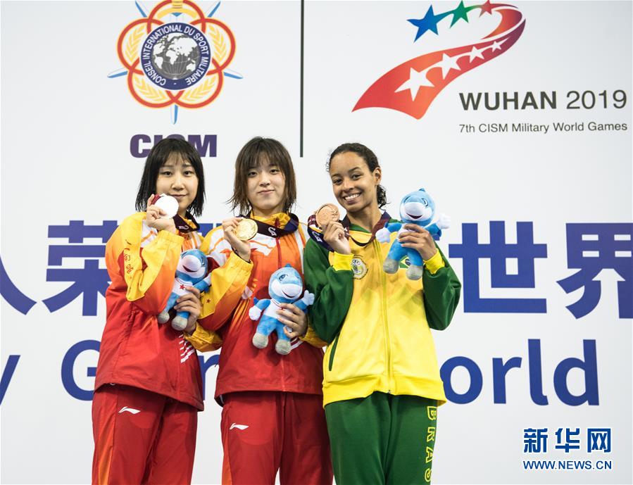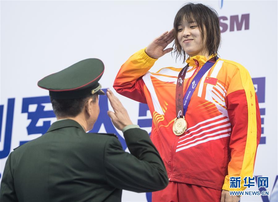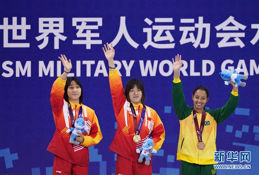10月20日,中國隊選手吳慧敏(右)、包雪怡在升旗儀式上。當日,在武漢舉行的第七屆世界軍人運動會水上救生項目女子50米假人救生決賽中,中國隊選手吳慧敏以33秒93的成績奪得冠軍,隊友包雪怡以35秒79的成績獲得亞軍。新華社記者肖藝九攝