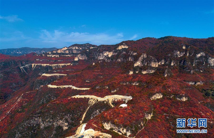這是10月19日無人機(jī)拍攝的河北省涉縣太行紅葉大峽谷景色。新華社記者王曉攝