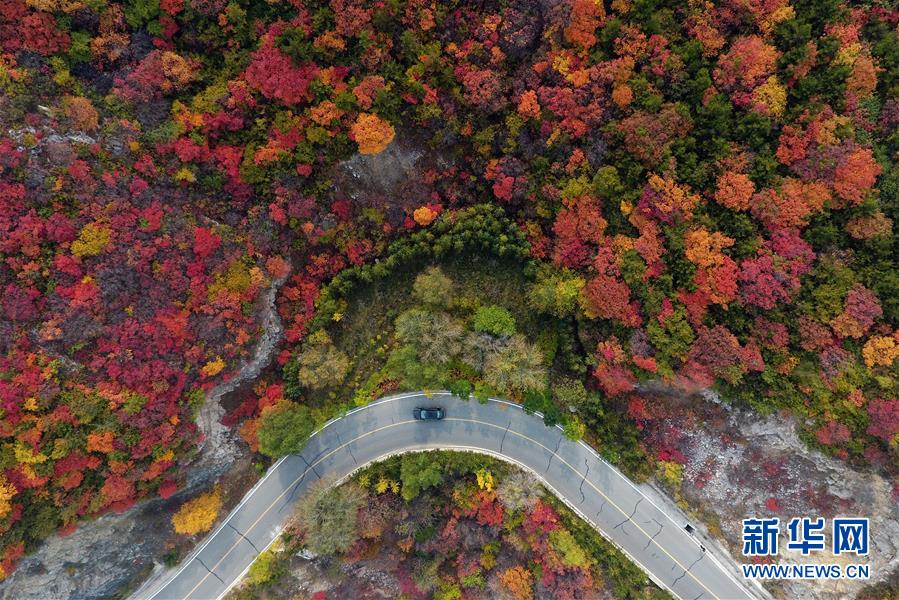 車輛行駛在山西省太原市玉泉山盤山公路上(10月22日無人機拍攝)。