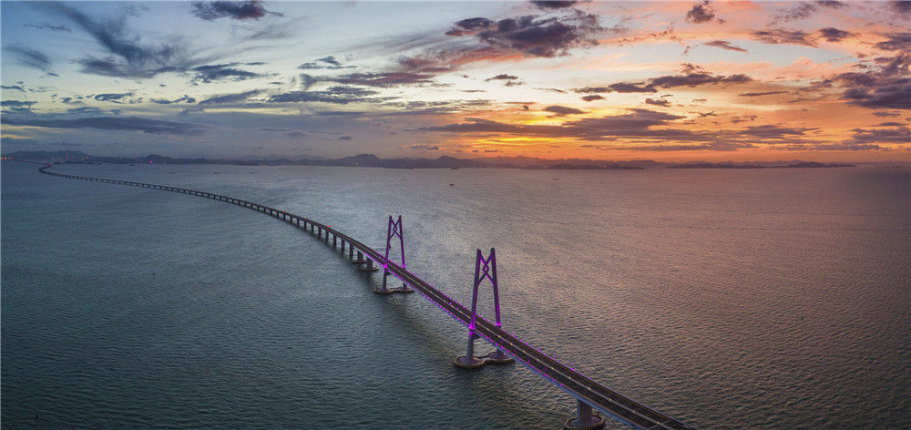 2018年7月18日,廣東珠海,滿天紅霞,亮燈后的港珠澳大橋跨立在伶仃洋上,進入通車前的最后準(zhǔn)備。張由瓊/視覺中國
