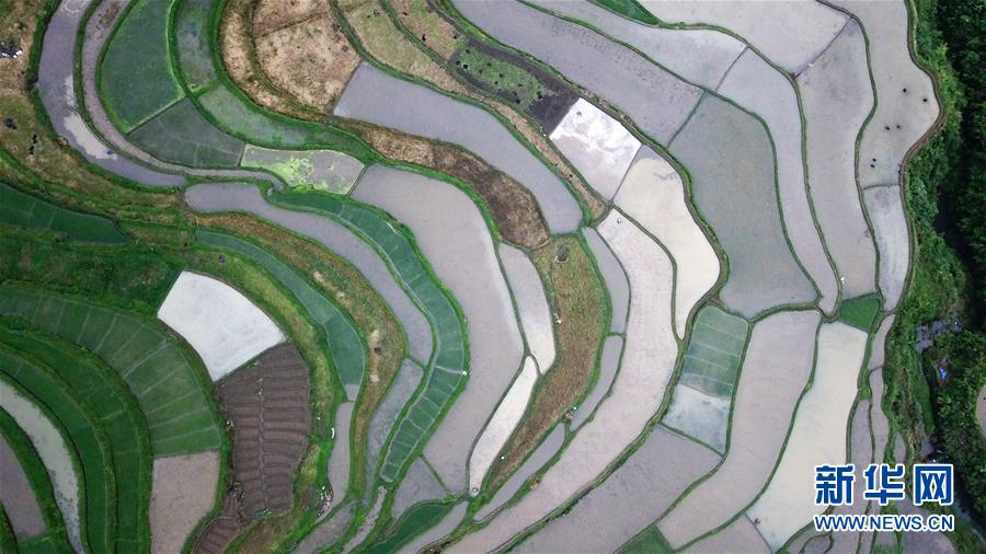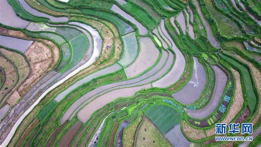 5月18日,農(nóng)民在貴州省丹寨縣龍泉鎮(zhèn)高要梯田里耕作(無人機(jī)拍攝)。初夏時(shí)節(jié),位于貴州省丹寨縣龍泉鎮(zhèn)的高要梯田景色優(yōu)美。新華社記者楊文斌攝