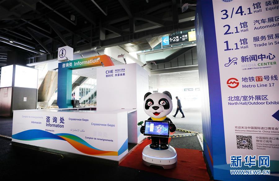 10月25日,位于國(guó)展中心內(nèi)的國(guó)家會(huì)議中心入口處張貼了醒目的進(jìn)博會(huì)吉祥物熊貓進(jìn)寶裝飾。  新華社記者 方喆攝