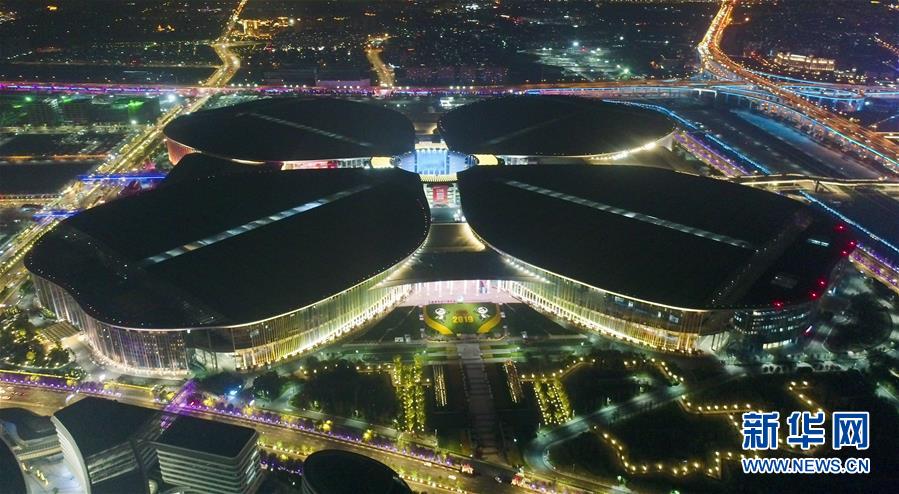 2019年11月5日,第二屆中國國際進(jìn)口博覽會將在上海開幕。夜幕下的國家會展中心(上海)燈光璀璨,流光溢彩,靜待八方賓客。新華社記者丁汀攝