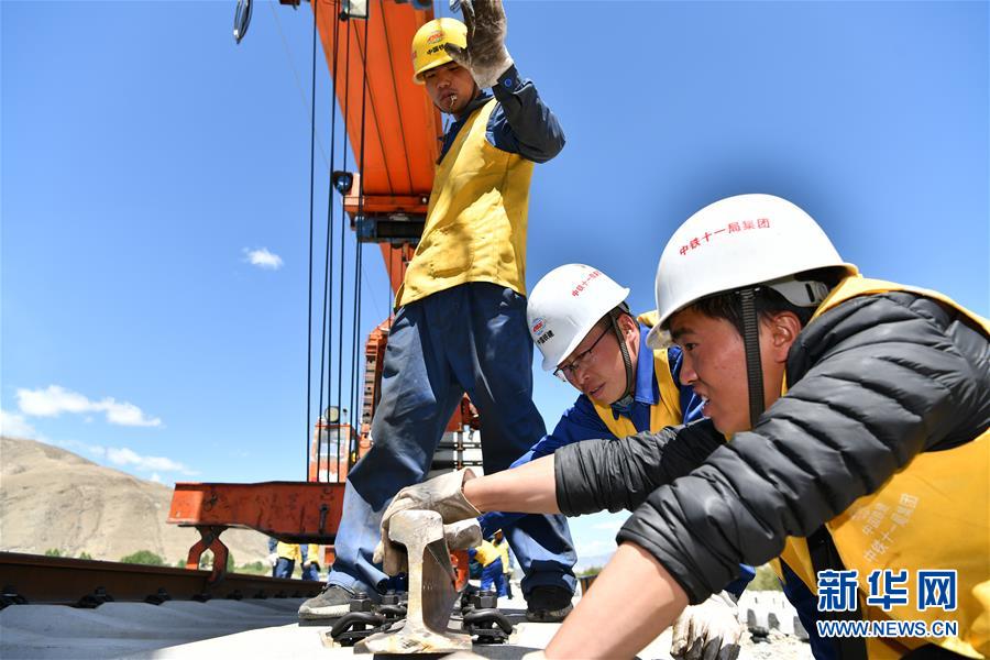 6月6日,負(fù)責(zé)鋪軌的中鐵十一局集團(tuán)的建設(shè)者在現(xiàn)場(chǎng)作業(yè)。新華社記者普布扎西攝