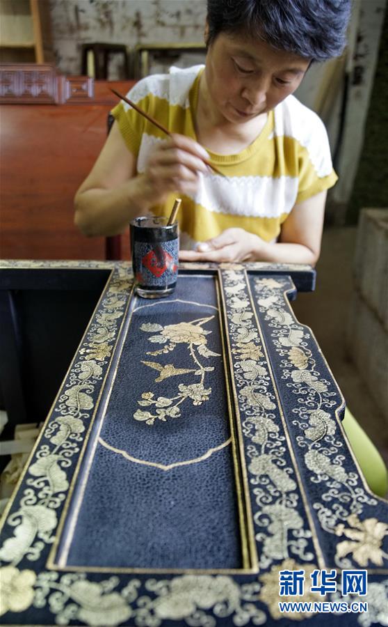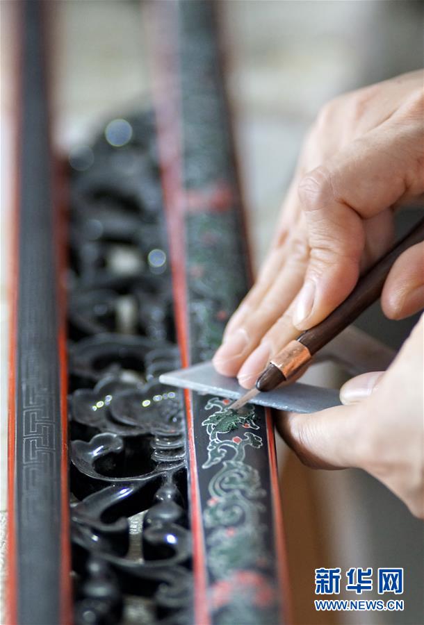 北京金漆鑲嵌有限責(zé)任公司工藝美術(shù)大師胡昕在創(chuàng)作漆畫(huà)屏風(fēng)(9月19日攝)。新華社記者李欣攝