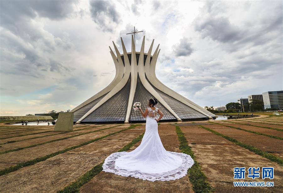 11月2日,一名新娘在巴西首都巴西利亞大教堂前拍攝婚紗照。新華社記者 蘭紅光 攝
