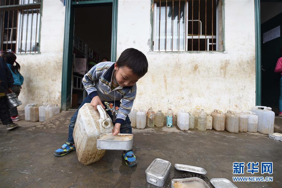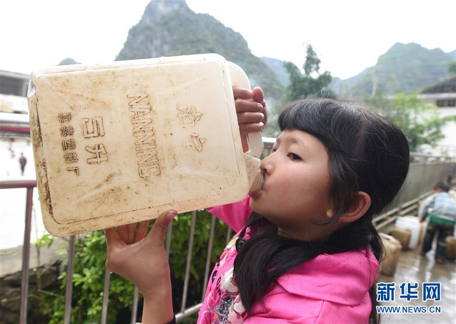 在廣西大化瑤族自治縣板升鄉(xiāng)八好小學(xué),一名學(xué)生喝水桶里的雨水(2014年11月24日攝)。八好小學(xué)有400多名學(xué)生,曾僅有一個(gè)不足100立方米的水柜,用于收集儲存樓頂?shù)挠晁瑢W(xué)生需定期定量用水。遇到長時(shí)間不下雨,學(xué)校需要到鄉(xiāng)政府所在地運(yùn)水。如今,學(xué)校修建了5個(gè)大水柜,并從兩公里外引泉水到校園,飲水難問題得到解決。新華社記者黃孝邦攝