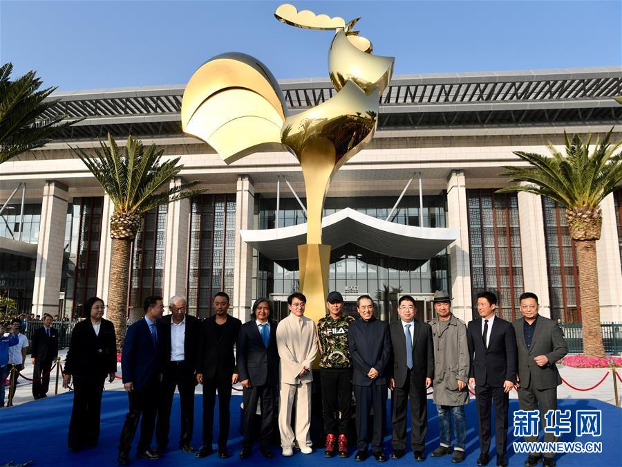 11月19日,嘉賓在第28屆金雞百花電影節(jié)金雞雕塑揭幕儀式上合影。新華社記者姜克紅攝