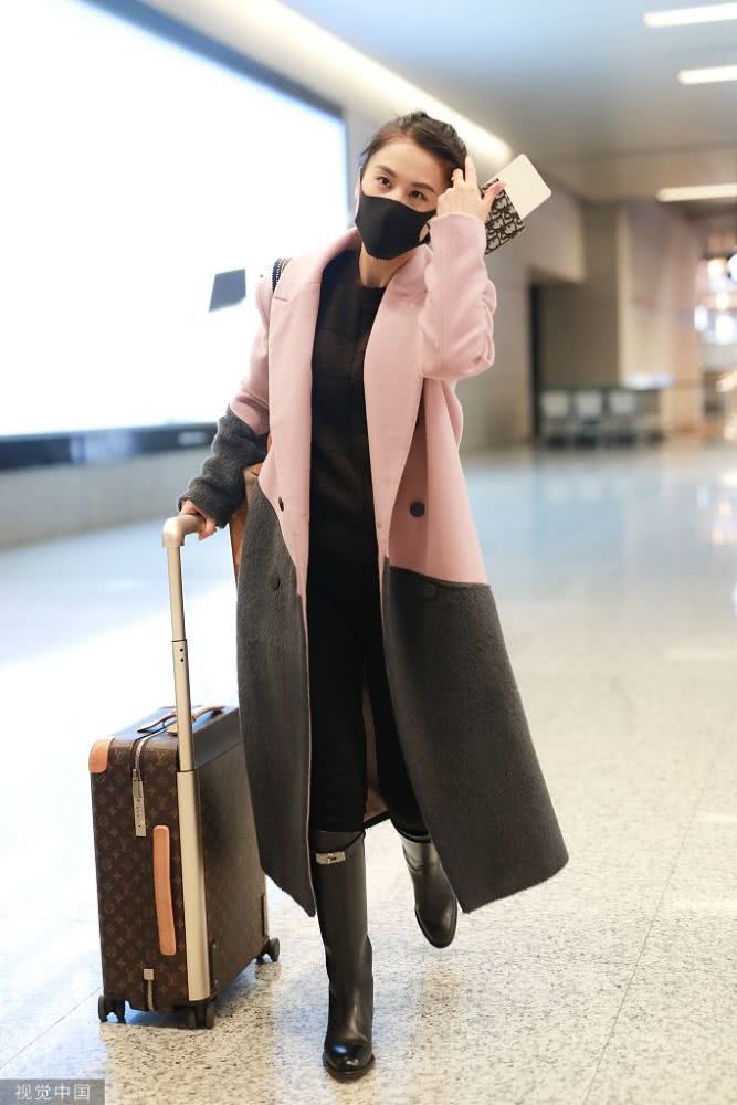 她穿大衣皮靴推行李箱滿滿商務(wù)范,扎小辮子五官清麗氣質(zhì)優(yōu)雅。