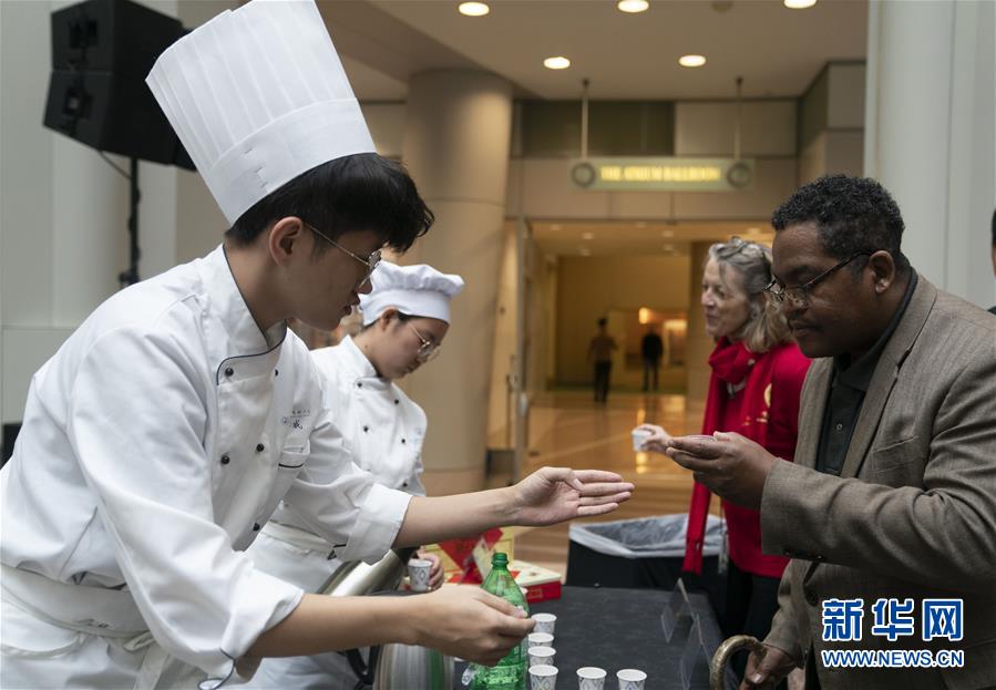 11月22日,在美國華盛頓,人們在“北京日”文化廟會活動(dòng)上品嘗中國小吃。作為中國北京和美國首都華盛頓締結(jié)友好城市35周年慶?;顒?dòng)的一部分,“北京日”文化廟會22日在華盛頓羅納德·里根大廈和國際貿(mào)易中心舉行。新華社記者劉杰攝