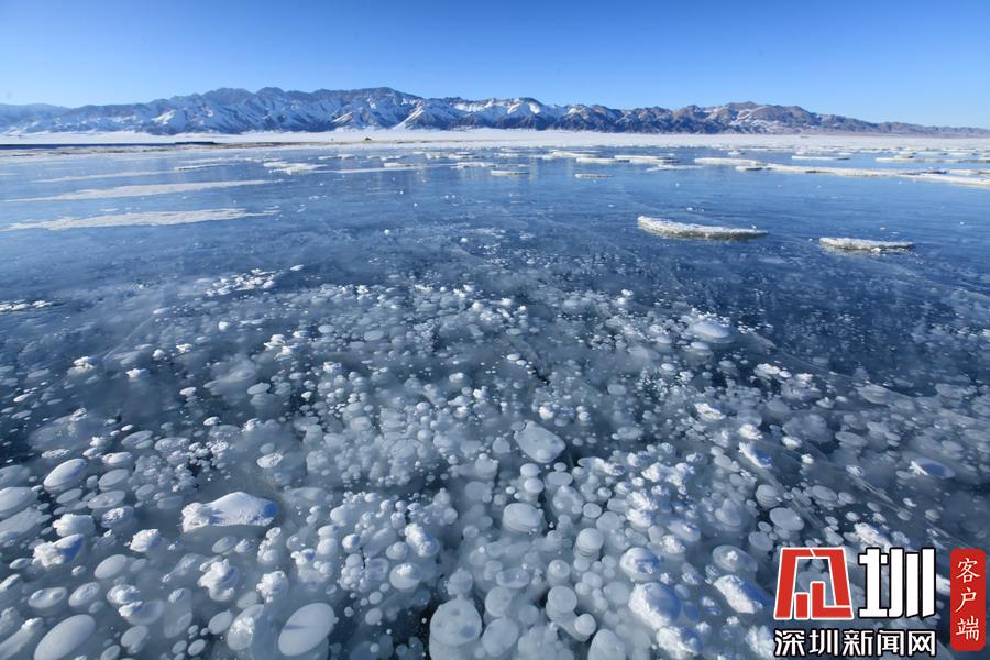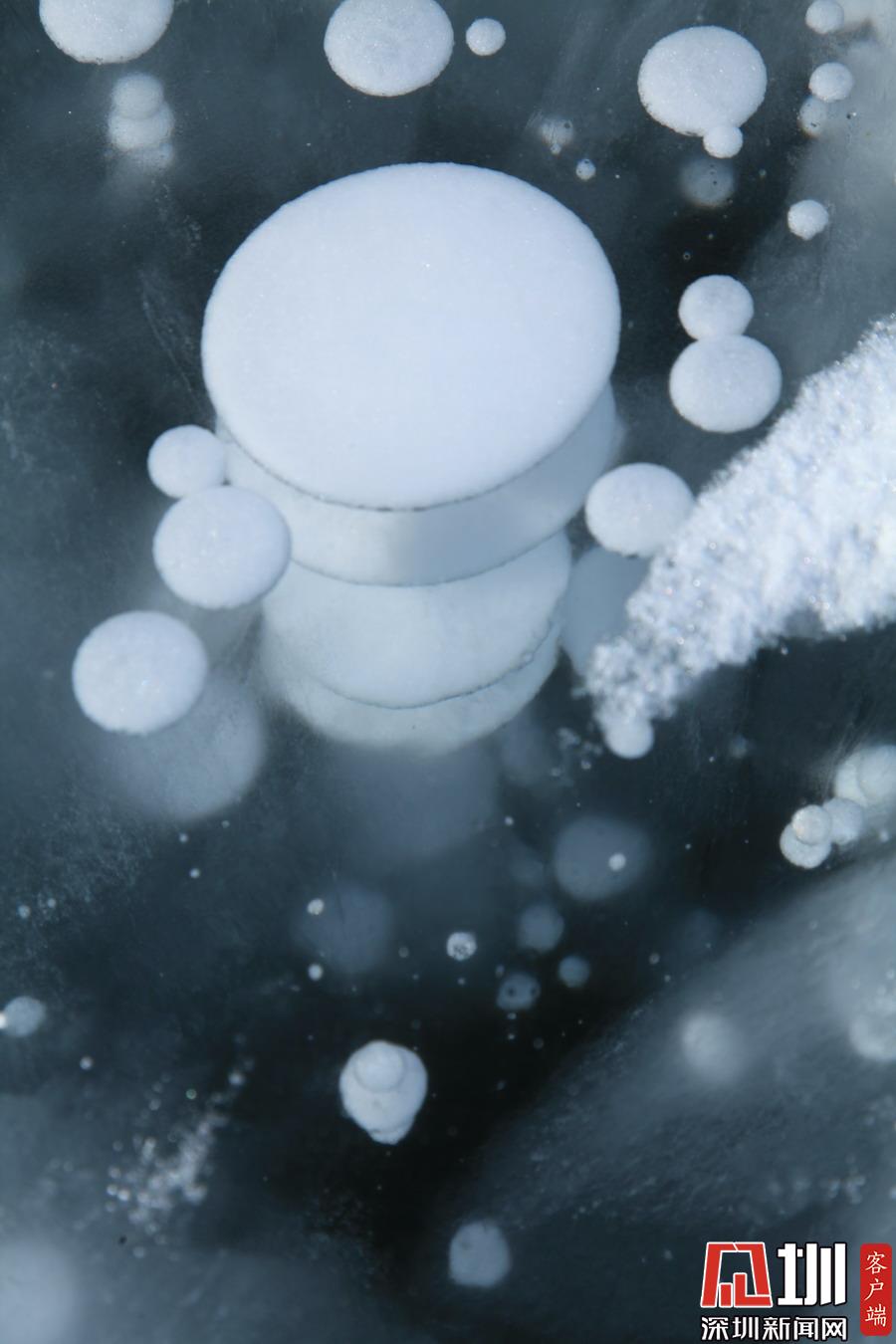 透過(guò)晶瑩剔透的冰面,可以看到一串串潔白氣泡分布在冰層中。