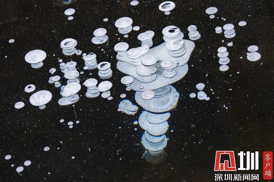 2019年11月26日,黑龍江漠河觀音山景區(qū)出現(xiàn)“冰泡”奇觀。透過(guò)晶瑩剔透的冰面,可以看到一串串潔白氣泡分布在冰層中。