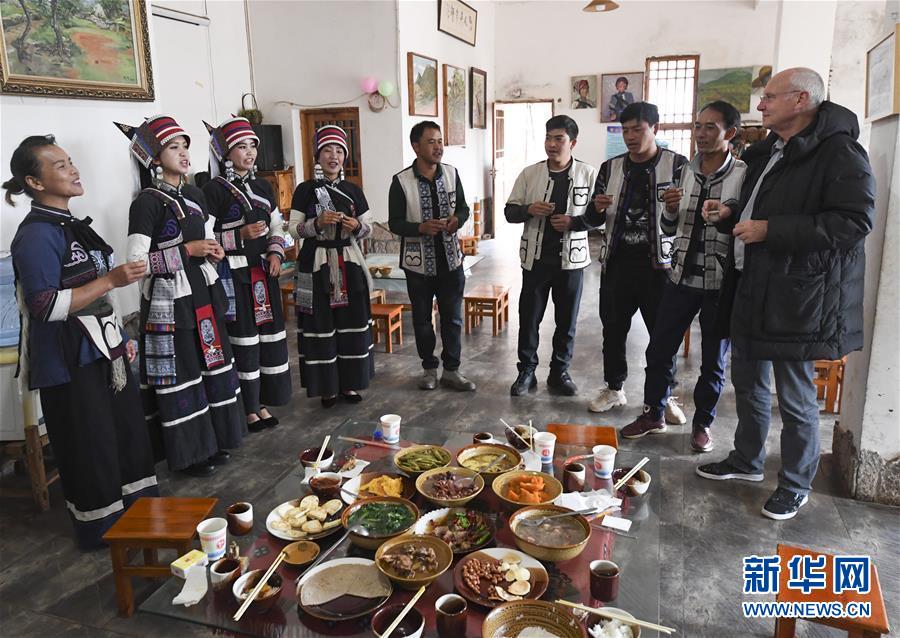 11月28日,大糯黑村村民畢興學(左五)、李學芝(左一)夫婦和工作人員們一起給外國游客(右一)祝酒。李學芝和丈夫畢興學經營著一家農家樂,生意紅火。新華社記者王全超攝