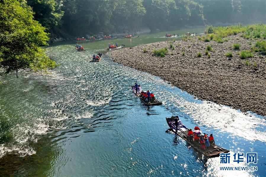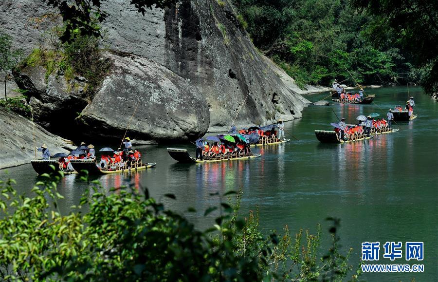 8月23日,游客在武夷山九曲溪乘竹筏游覽。暑期即將接近尾聲,福建武夷山游客仍絡(luò)繹不絕。盡管2019年暑期武夷山兩次遇到暴雨災(zāi)害造成景區(qū)關(guān)閉,在當(dāng)?shù)芈糜尾块T的努力下很快恢復(fù)旅游秩序。新華社記者張國(guó)俊攝
