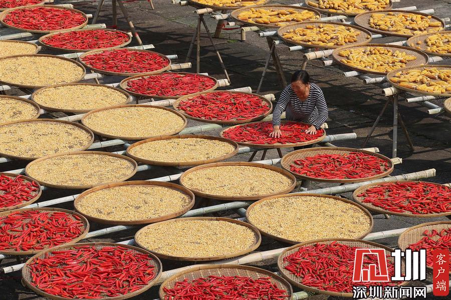 當日立秋節(jié)氣,江西婺源縣篁嶺古村的農作物普遍豐收,村民們又迎來了一年一度的“曬秋”季。
