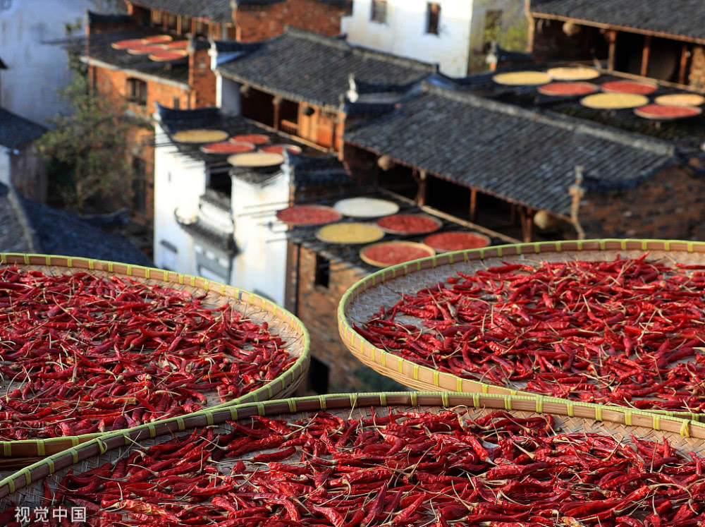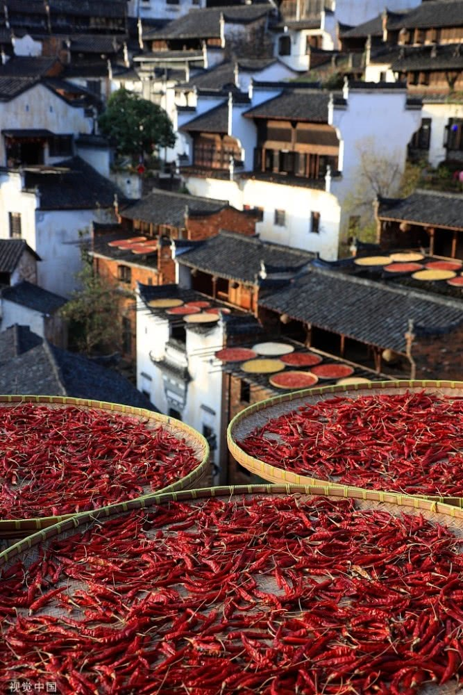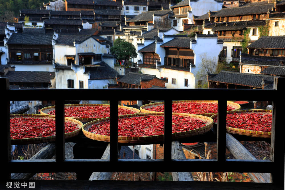 2018年8月7日,江西婺源縣篁嶺古村落,壯觀“曬秋”場景。當日立秋節(jié)氣,江西婺源縣篁嶺古村的農作物普遍豐收,村民們又迎來了一年一度的“曬秋”季。村民們將收獲來的紅辣椒、玉米、南瓜、稻谷和菊花等色彩斑斕的農作物,晾曬在依山而建的徽派民居房前屋后的木制曬架上,在秋日陽光的照射下,色彩繽紛圓圓的曬扁,鋪就在錯落有致的徽派民居之間,格外璀璨奪目,蔚為壯觀。目前,“篁嶺曬秋”已經(jīng)成為中國鄉(xiāng)村旅游的一張名片。