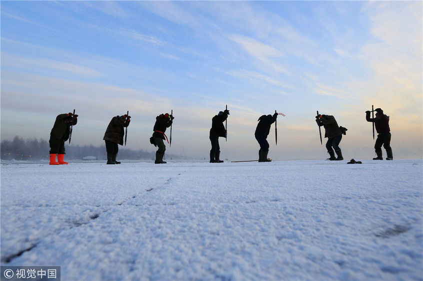 2018年12月11日,黑龍江省哈爾濱市,松花江上,采冰者們彎腰拉繩,宛如纖夫般拽重達(dá)半噸的冰塊出水。采冰者都是自哈市江北萬寶、東發(fā)、沙陀子等鄉(xiāng)鎮(zhèn)的農(nóng)民,他們每年冬閑時(shí)都會(huì)親屬、村鄰之間結(jié)伴到松花江畔采冰,有的采冰人,已經(jīng)連續(xù)干了二十多年。每個(gè)采冰季,他們每天要在冰面上工作10-12個(gè)小時(shí),每個(gè)采冰組,一天要拽出冰塊2000-3000塊,一個(gè)近20天的采冰季,每人能收入近萬元。