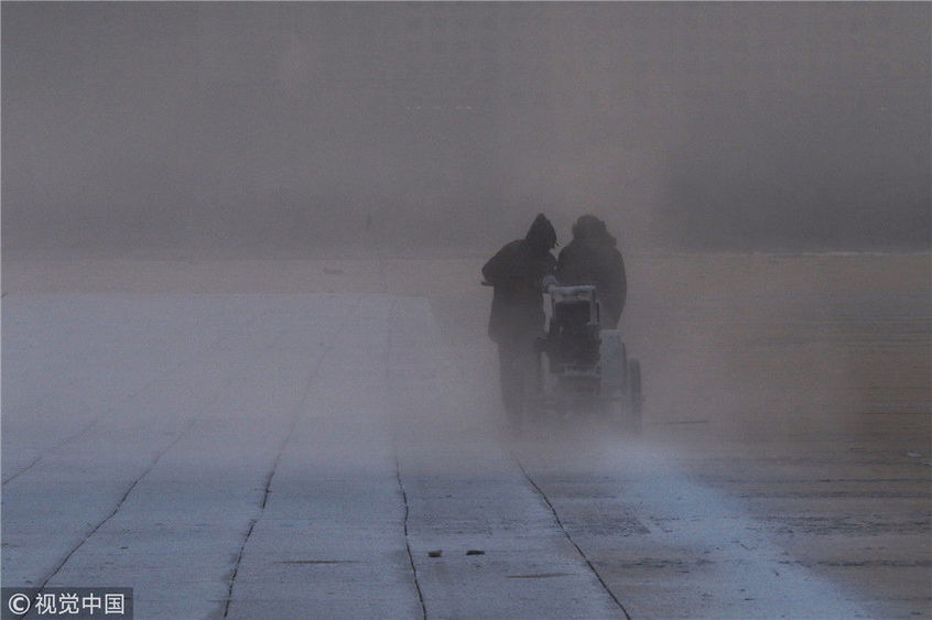 2018年12月11日,黑龍江省哈爾濱市,松花江上,采冰者們彎腰拉繩,宛如纖夫般拽重達半噸的冰塊出水。采冰者都是自哈市江北萬寶、東發(fā)、沙陀子等鄉(xiāng)鎮(zhèn)的農民,他們每年冬閑時都會親屬、村鄰之間結伴到松花江畔采冰,有的采冰人,已經連續(xù)干了二十多年。每個采冰季,他們每天要在冰面上工作10-12個小時,每個采冰組,一天要拽出冰塊2000-3000塊,一個近20天的采冰季,每人能收入近萬元。視覺中國