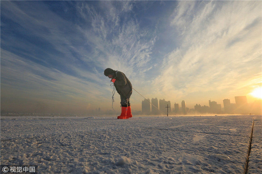 2018年12月11日,黑龍江省哈爾濱市,松花江上,采冰者們彎腰拉繩,宛如纖夫般拽重達半噸的冰塊出水。采冰者都是自哈市江北萬寶、東發(fā)、沙陀子等鄉(xiāng)鎮(zhèn)的農(nóng)民,他們每年冬閑時都會親屬、村鄰之間結(jié)伴到松花江畔采冰,有的采冰人,已經(jīng)連續(xù)干了二十多年。每個采冰季,他們每天要在冰面上工作10-12個小時,每個采冰組,一天要拽出冰塊2000-3000塊,一個近20天的采冰季,每人能收入近萬元。