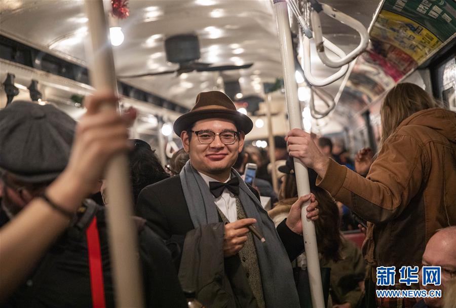 12月8日,在美國(guó)紐約,人們搭乘“懷舊專(zhuān)列”。每年感恩節(jié)到新年之間的星期日,紐約地鐵都會(huì)用1932年至1977年間使用的老式列車(chē)在運(yùn)營(yíng)的線(xiàn)路上開(kāi)行特別的“懷舊專(zhuān)列”,人們穿戴舊時(shí)服飾專(zhuān)程前來(lái)搭乘,體驗(yàn)時(shí)光回溯的奇妙旅程。新華社記者王迎攝