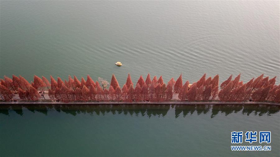 12月10日,一只小船在湖南烈士公園年嘉湖湖面行駛時(shí)經(jīng)過游道(無人機(jī)拍攝)。新華社記者陳澤國(guó)攝