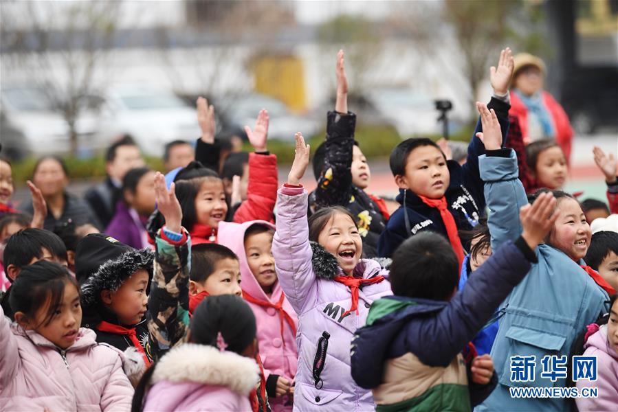 12月12日,中益鄉(xiāng)小學(xué)的同學(xué)們在文藝演出現(xiàn)場與演員互動。新華社記者 王全超 攝