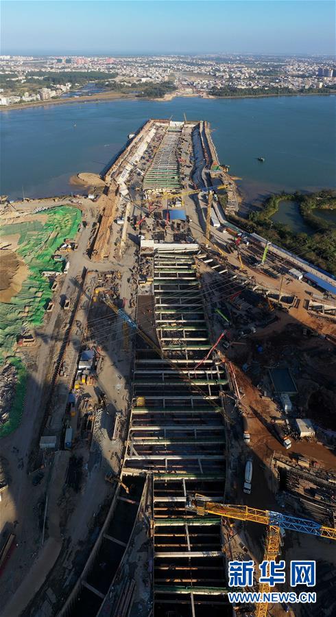 正在施工的海口文明東越江通道項(xiàng)目(12月14日無(wú)人機(jī)拍攝)。 新華社記者 郭程 攝