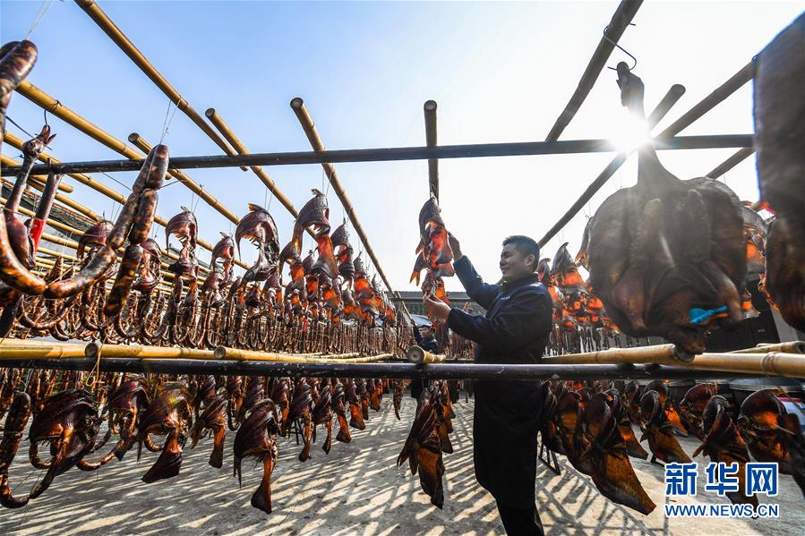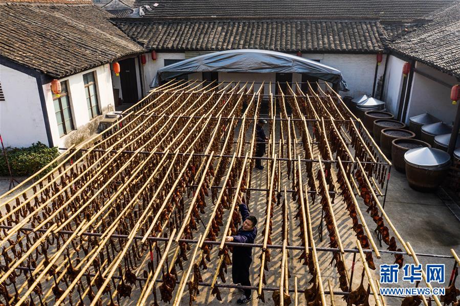 初冬時節(jié),浙江省紹興市柯橋區(qū)安昌古鎮(zhèn)開啟了傳統(tǒng)臘味制作、上市的季節(jié)。當(dāng)?shù)匕傩沼脗鹘y(tǒng)醬油、黃酒、香料等手工腌制臘腸、醬鴨、魚干、醬鵪鶉、醬排骨等紹興特色醬貨,在冬季的陽光下進行晾曬,滿街飄香的臘味也成了這座江南古鎮(zhèn)的獨特風(fēng)景。安昌古鎮(zhèn)是浙江省歷史文化名鎮(zhèn),有著一千多年歷史,比較完善地保存了古吳越地區(qū)沿襲千百年來的民俗風(fēng)情。每年大雪節(jié)氣前后,安昌當(dāng)?shù)匕傩瞻凑諅鹘y(tǒng)習(xí)俗挑選晴朗好天氣制作、晾曬傳統(tǒng)醬貨,各類醬貨顏色黑紅油亮,咸鮮適口,是當(dāng)?shù)囟镜奶厣珎鹘y(tǒng)美食。新華社記者徐昱攝