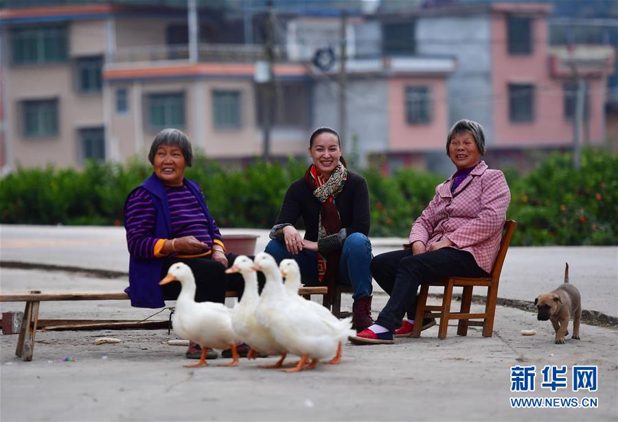 在鹿寨縣拉溝鄉(xiāng)木龍村,李柳萍(右二)在回村采購土特產(chǎn)途中和老人們交流(12月14日攝)。新華社記者黃孝邦攝
