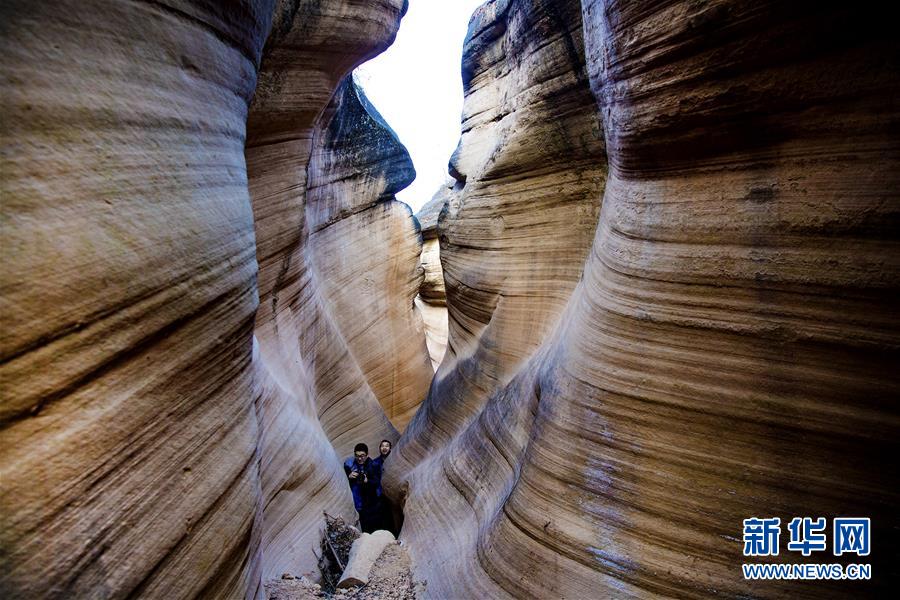 12月17日,游人在志丹縣雙河鎮(zhèn)毛項(xiàng)峽谷內(nèi)游覽。毛項(xiàng)峽谷位于陜西省延安市志丹縣雙河鎮(zhèn)毛項(xiàng)村,峽谷全長12公里,分為9段,曲折綿延,谷內(nèi)石壁凹凸不平,其中最窄處只能容一人側(cè)身通過,堪稱黃土高原上的自然奇觀。新華社記者陶明攝