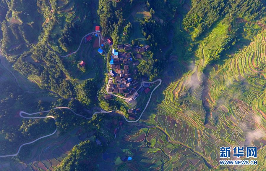 在融水苗族自治縣桿洞鄉(xiāng)黨鳩村下黨鳩屯,道路已經(jīng)修到家家戶戶門(mén)前(6月21日無(wú)人機(jī)拍攝)。新華社記者黃孝邦攝