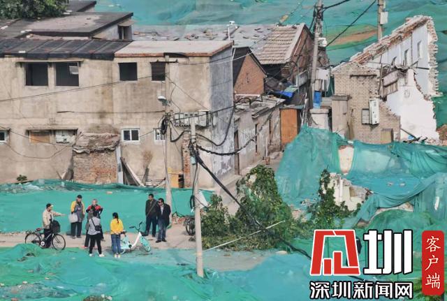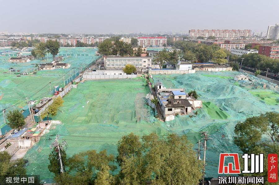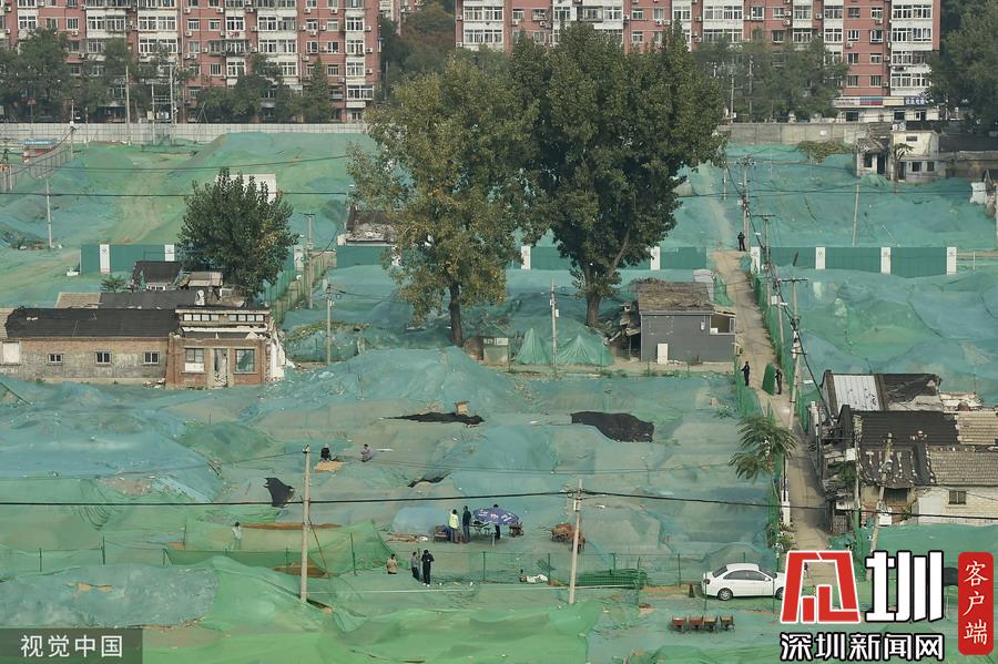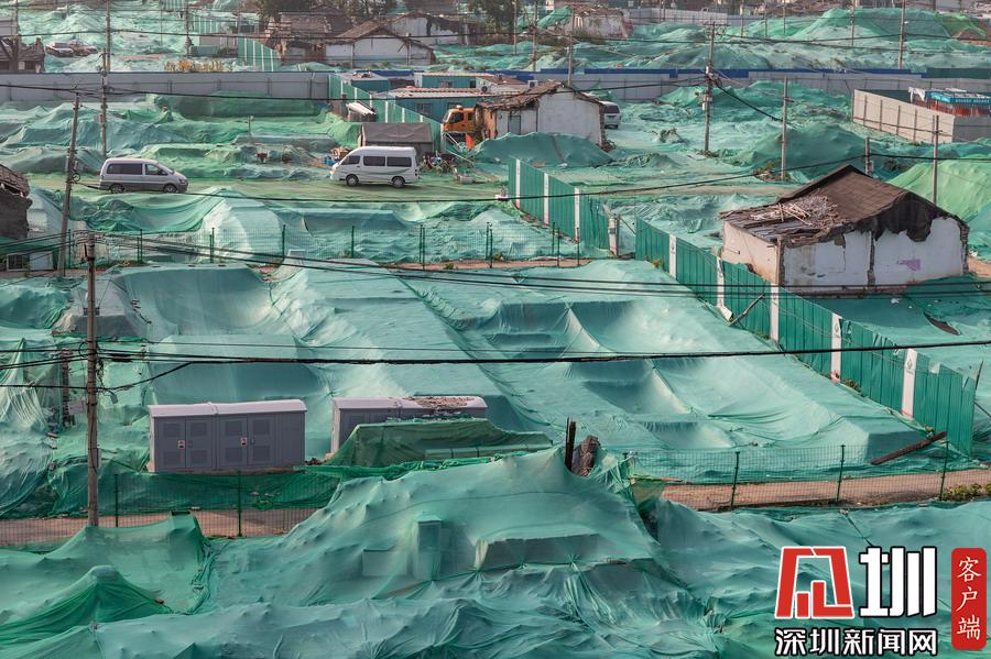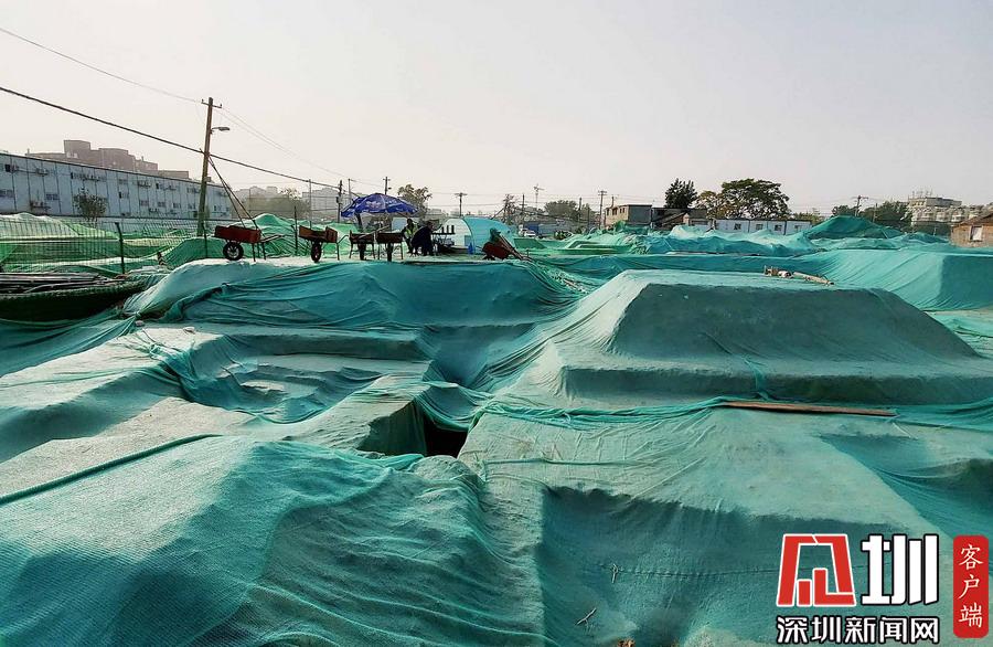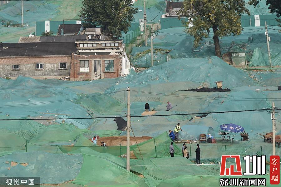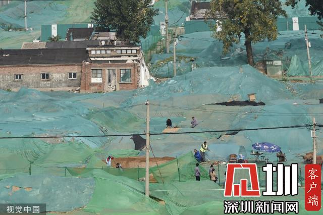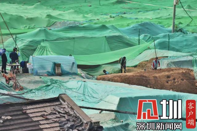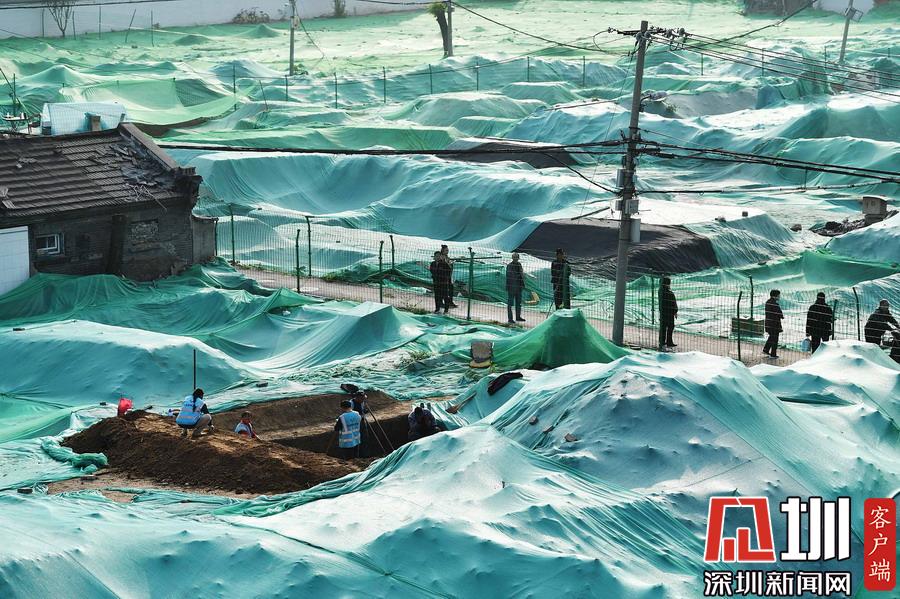圍擋內,工地大部分被綠色苫布覆蓋,只露出幾處規(guī)整的探坑??脊殴ぷ髡哒诰o張忙碌中,有些工作人員戴著草帽,坐在馬扎上記錄發(fā)掘細節(jié),還有一些穿著藍色背心的工作人員使用工具正在做清理工作。