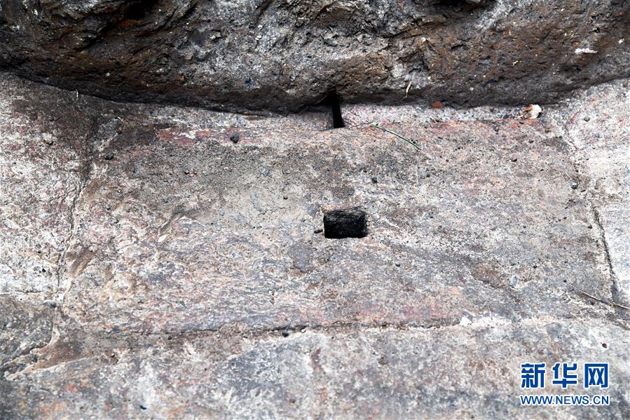 在瑯琊臺遺址考古發(fā)掘現(xiàn)場拍攝的秦漢時期的石砌地漏,六方大小石塊斜面壘砌,中間的石塊開有方形小孔。根據(jù)地漏的形狀和制作的精細程度,可以初步判斷它應該用于室內排水(12月21日攝)。新華社記者李紫恒攝