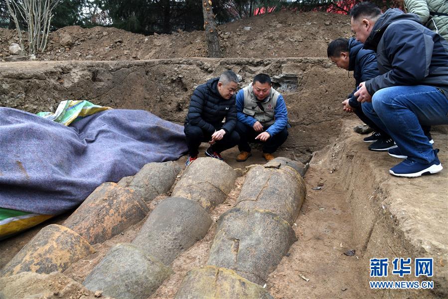 12月21日拍攝的瑯琊臺遺址考古發(fā)掘現(xiàn)場。三組整齊的陶制管道規(guī)整排列,管道較粗,管壁較厚,陶水管為兩端大小各異的標準件,與現(xiàn)代城市地下排水管件類似。新華社記者李紫恒攝