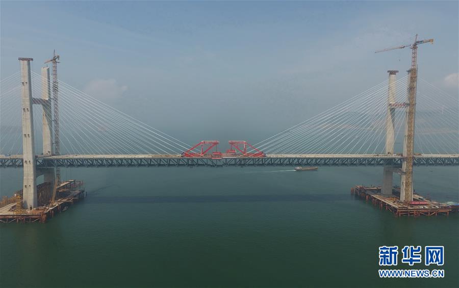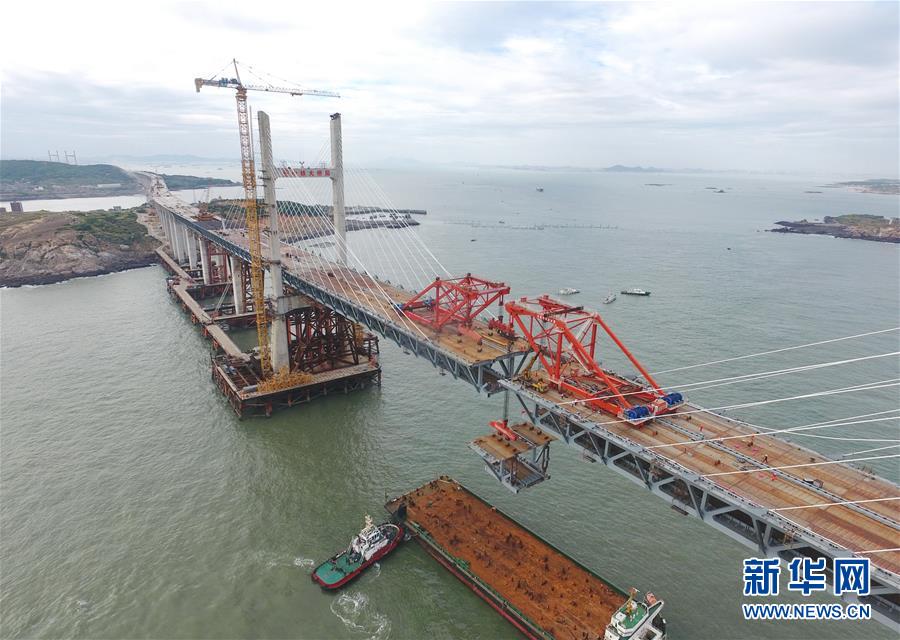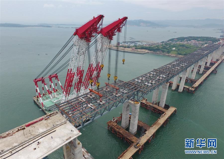 9月21日,平潭海峽公鐵大橋鼓嶼門航道橋的鋼桁梁在吊裝中(無(wú)人機(jī)拍攝)。9月25日上午,隨著一段長(zhǎng)17米、重473噸的鋼桁梁被精確固定到位,總長(zhǎng)16.34公里的平潭海峽公鐵大橋合龍貫通。平潭海峽公鐵大橋是福州至平潭鐵路控制性工程,也是“十三五”規(guī)劃中北京至臺(tái)灣高鐵的先期工程。大橋起于福州市長(zhǎng)樂(lè)區(qū),“踏”過(guò)四座小島后抵達(dá)中國(guó)第五大島平潭,上層設(shè)計(jì)為時(shí)速100公里的六車道高速公路,下層為設(shè)計(jì)時(shí)速200公里的高鐵。據(jù)福建福平鐵路公司介紹,大橋計(jì)劃2020年正式通車。在六年建設(shè)過(guò)程中,平潭海峽公鐵大橋所應(yīng)用研發(fā)的多項(xiàng)技術(shù)、裝備創(chuàng)下國(guó)內(nèi)外紀(jì)錄。新華社記者林善傳攝