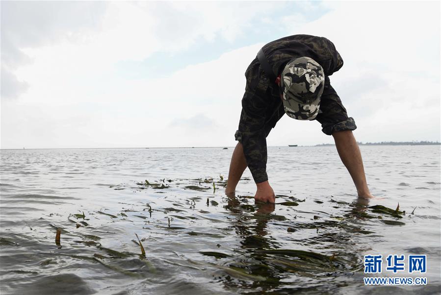 海南清瀾港省級自然保護(hù)區(qū)護(hù)林員呂詩陽在保護(hù)區(qū)內(nèi)的灘涂上查看海草情況(12月17日攝)。 新華社記者楊冠宇攝