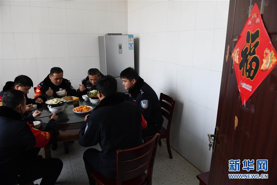 金寨火車站派出所民警在吃午飯(12月19日攝)。新華社記者張端攝