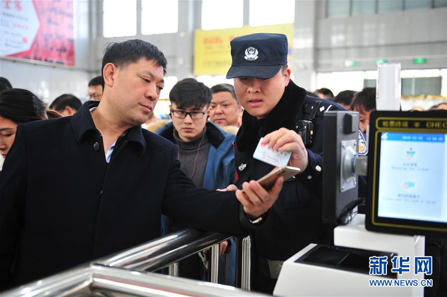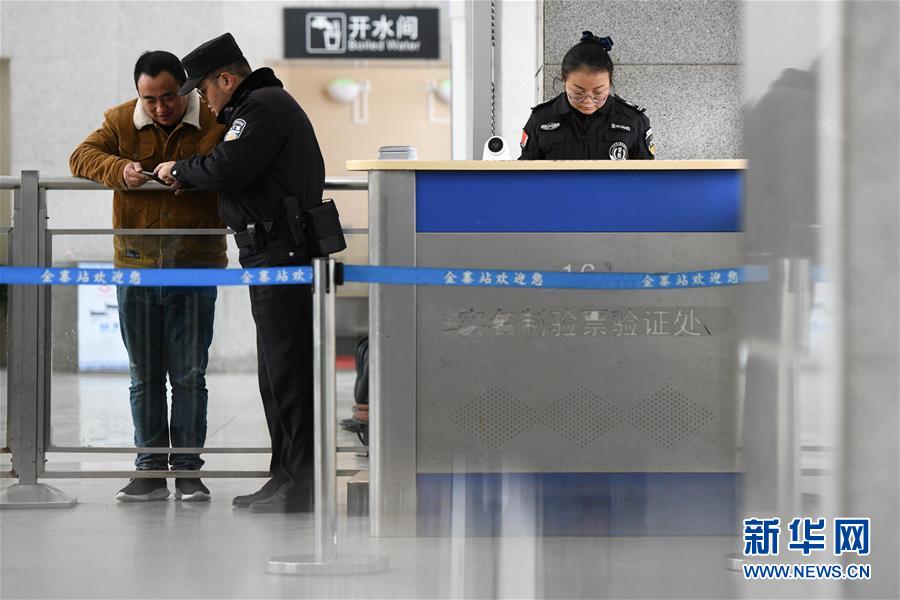 金寨火車站派出所民警張嗣一(右二)在檢票口執(zhí)勤(12月19日攝)。新華社記者陳立群攝