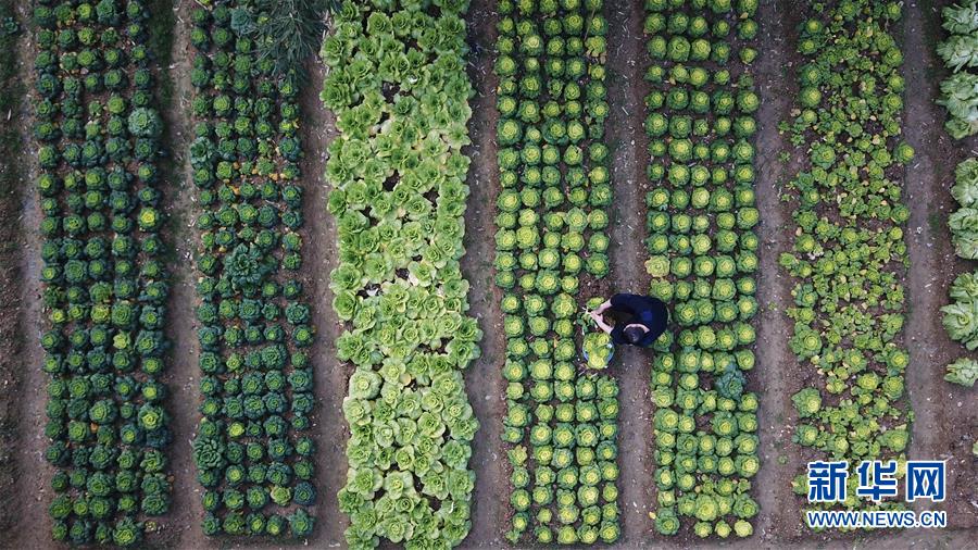 金寨火車站派出所民警呂錦鵬在菜園摘菜(12月19日無人機(jī)拍攝)。由于金寨火車站派出所離縣城較遠(yuǎn),平時(shí)買菜不方便,民警們在院子里開墾了一處小菜園。新華社記者張端攝