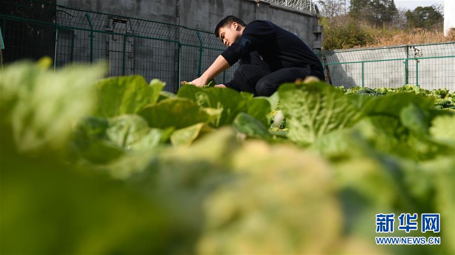 金寨火車站派出所民警呂錦鵬在菜園摘菜(12月19日攝)。由于金寨火車站派出所離縣城較遠(yuǎn),平時(shí)買菜不方便,民警們在院子里開墾了一處小菜園。新華社記者張端攝