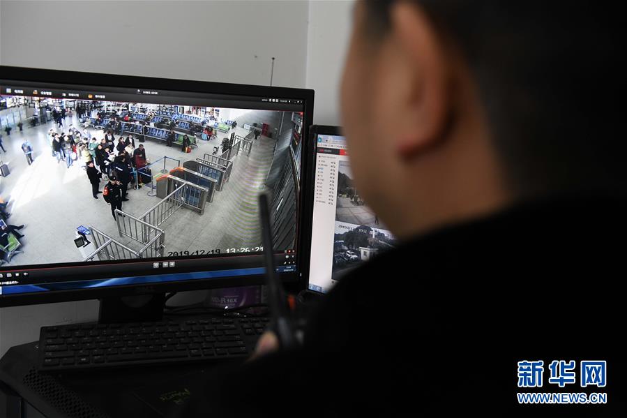 金寨火車站派出所民警何津超通過監(jiān)控視頻了解候車大廳內(nèi)的實(shí)時(shí)情況(12月19日攝)。新華社記者張端攝