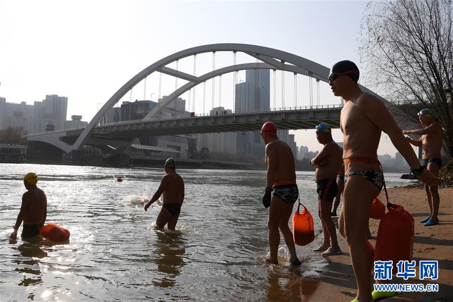 12月19日,在蘭州市馬拉松文化主題公園附近的黃河岸邊,冬泳愛(ài)好者入水準(zhǔn)備冬泳。新華社記者馬寧攝