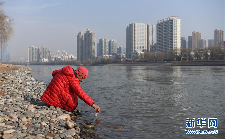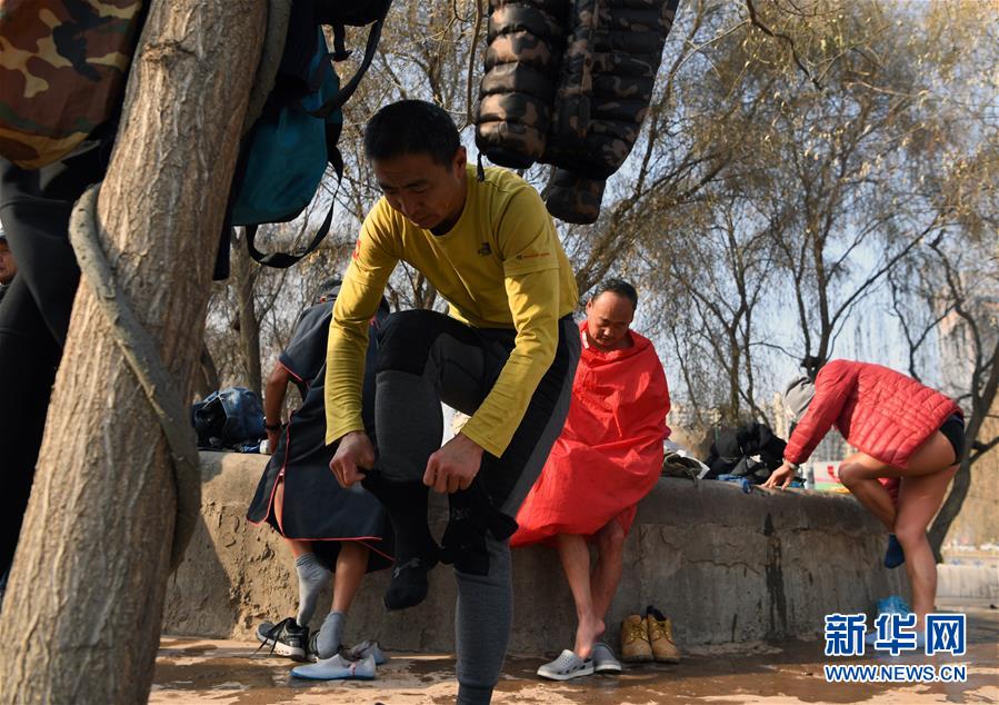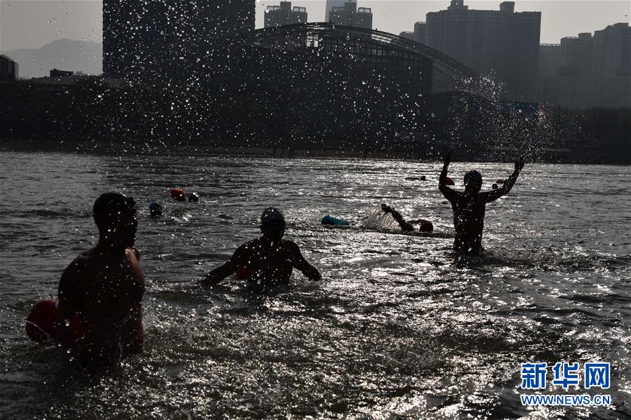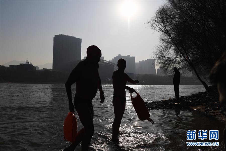 12月19日,在蘭州市馬拉松文化主題公園附近的黃河岸邊,冬泳愛好者入水準(zhǔn)備冬泳。新華社記者馬寧攝