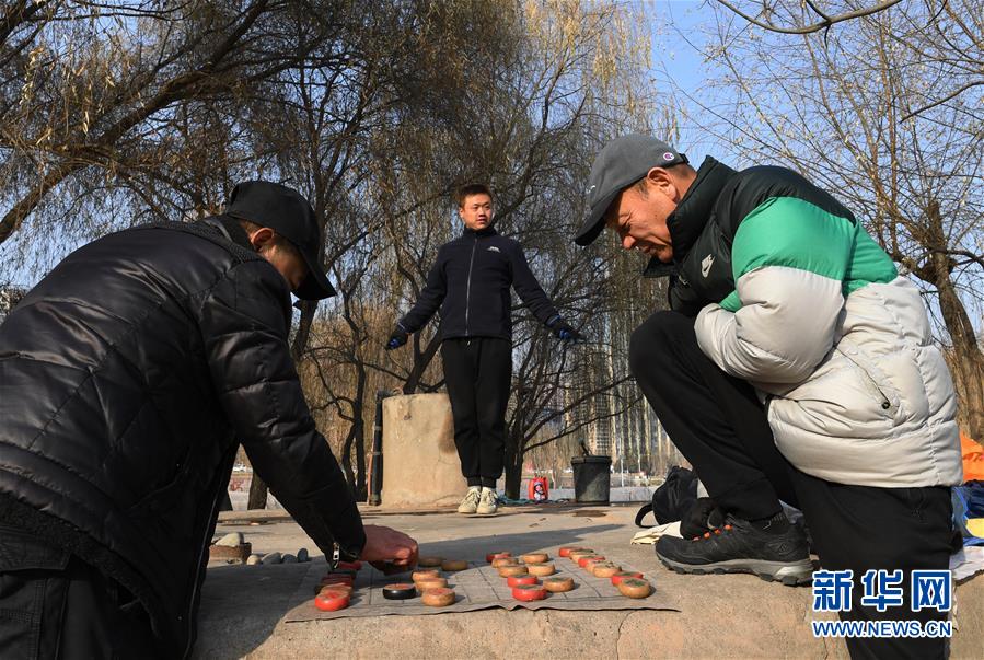 12月20日,冬泳愛好者張敏捷(中)冬泳后上岸跳繩暖身,張勝(右)結(jié)束冬泳后在一旁下棋。新華社記者陶希夷攝