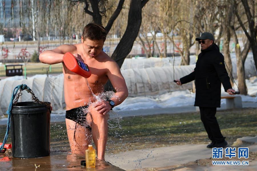 12月18日,冬泳愛好者李勇在上岸前向身上潑水。新華社記者陳斌攝