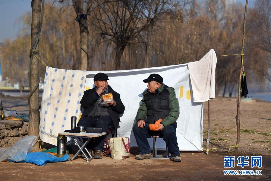 12月21日,72歲的石金城(左)在黃河中冬泳后在岸邊曬太陽(yáng),一邊聽著西北民歌吃東西一邊和朋友交談。新華社記者陶希夷攝