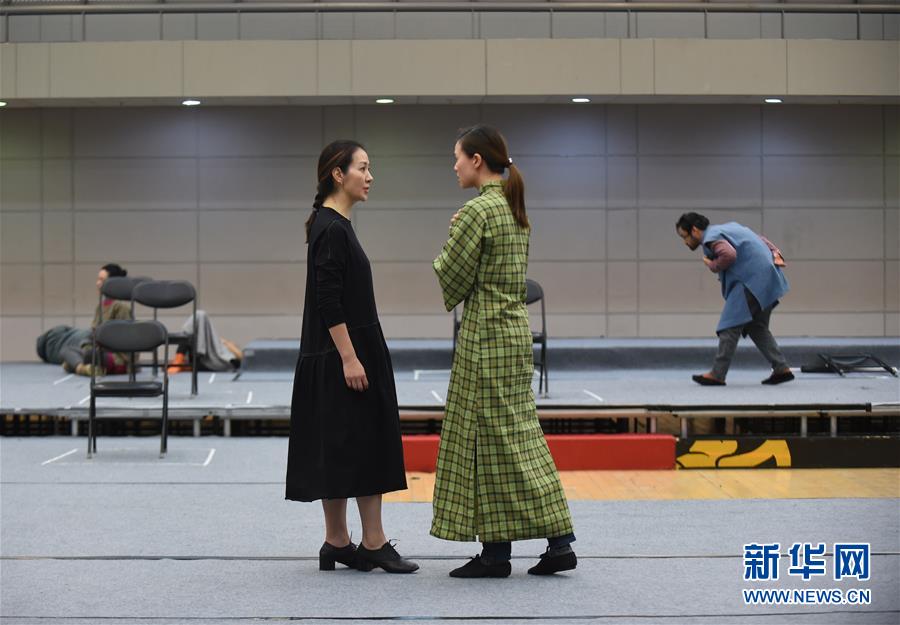 12月26日,在話劇《二月》中飾演陶嵐的演員盧芳(前左)和飾演文嫂的演員黃薇(前右)在排練。